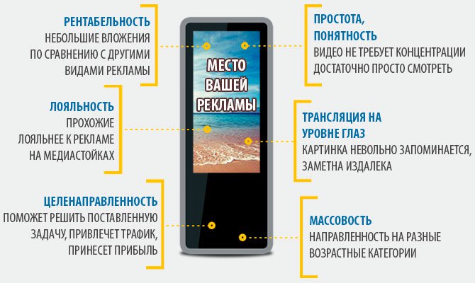 На сегодняшний день наряду с традиционными, всеми известными видами рекламы, такими как внешняя реклама на биллбордах, набирает обороты и продвижение услуг с помощью рекламы на видеостойках, расположенных не снаружи, а внутри бизнес центров, магазинов, аэропортов и прочих мест скопления людей. Это обусловлено тем, что целевая аудитория, требуемая для конкретного бизнес проекта или рекламы нового продукта с гораздо большей вероятностью может быть сконцентрирована там, где её присутствие согласуется с внешними факторами. Иными словами, люди, заинтересованные в покупке нового средства для ухода или повседневного использования, скорее всего, обратят внимание на те виды рекламы, которые расположены в местах их наиболее частого посещения, при этом, не бросаясь в глаза и не надоедая.